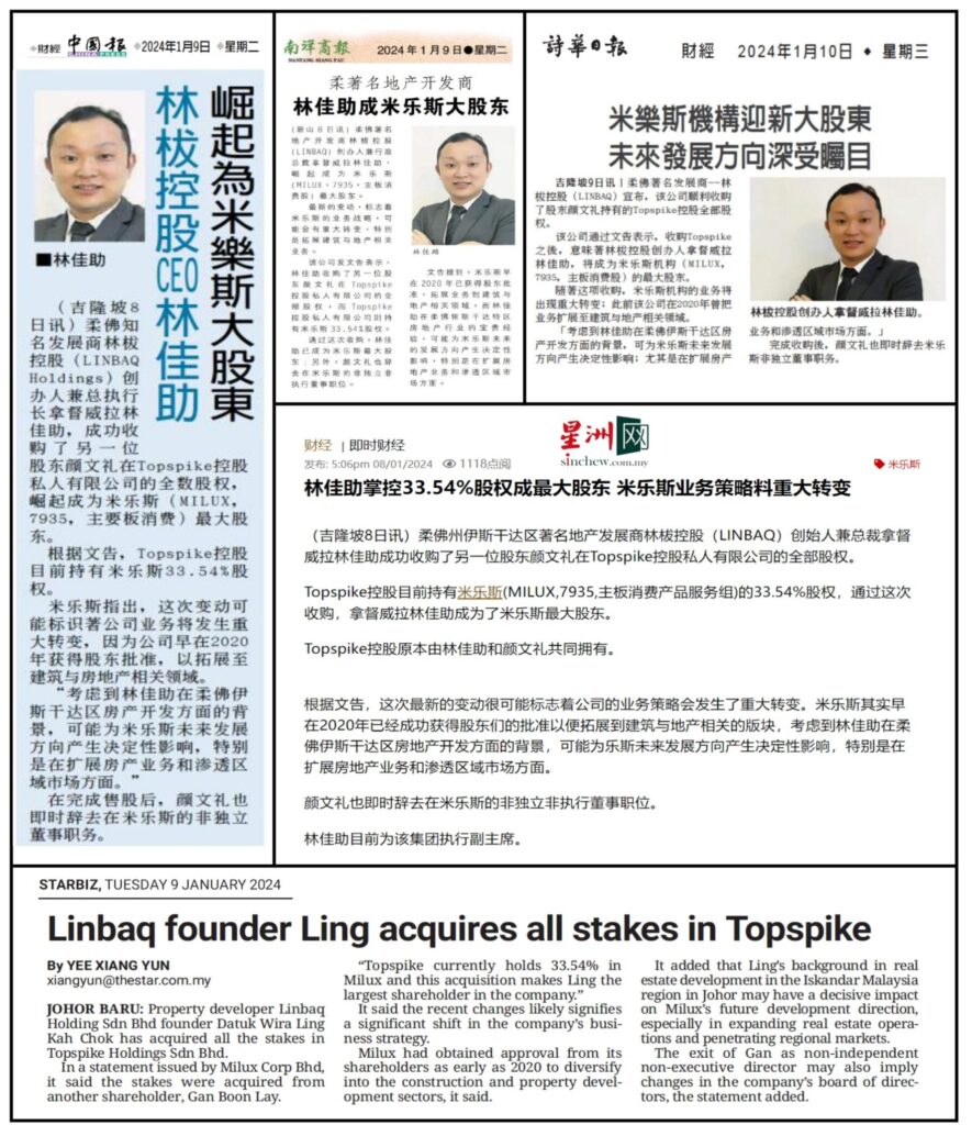 LINBAQ CEO Acquires All Stakes in Topspike and becomes major shareholder of Milux
