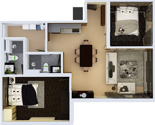 2房式户型拥有更宽敞的厨房以及舒适的客厅,适合年轻的家庭或情侣居住。