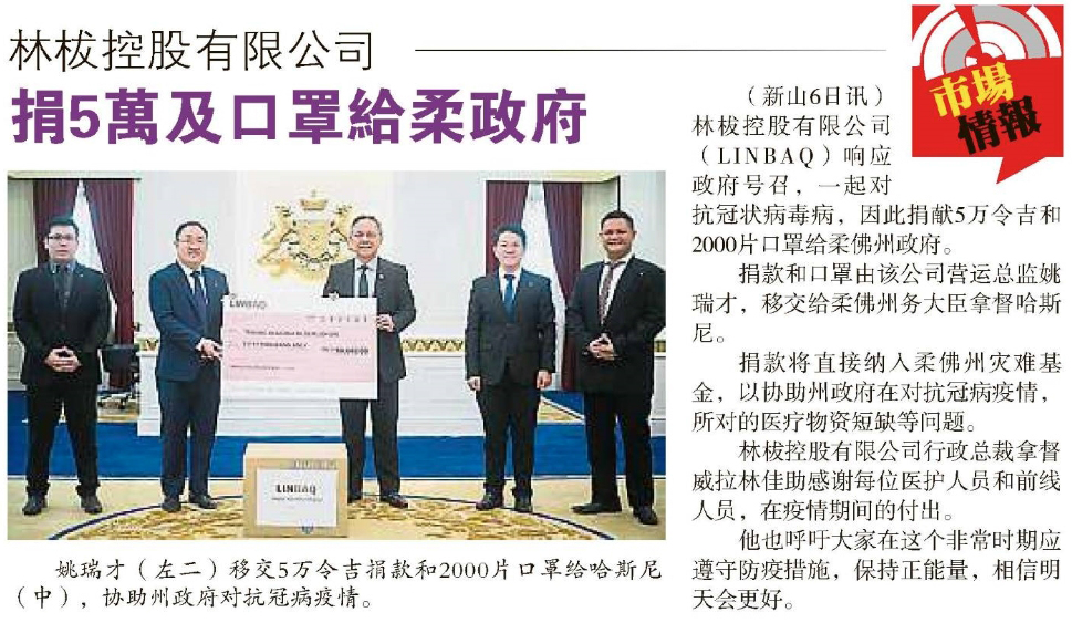 LINBAQ donates RM50,000 & 2,000 pieces of face masks to Johor Government